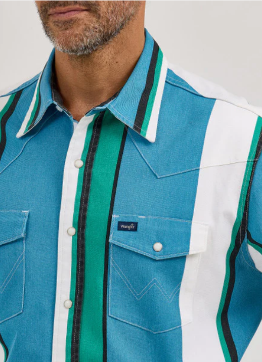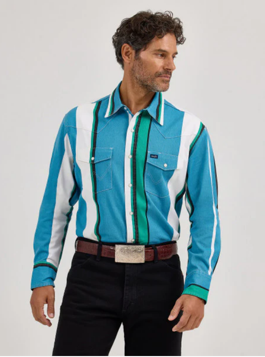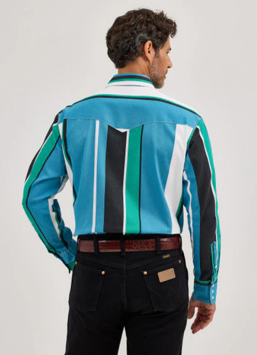 he Wrangler Men’s Vintage Brushpopper Long Sleeve Shirt in Aqua Blue Multi Stripe brings a fun twist to classic Western flair. With its striking retro stripes in deep purples and bold tones, this shirt features a relaxed fit, pearl snap buttons, and genuine Western yokes. Perfect for the cowboy who loves a splash of color without losing that legendary Western edge.