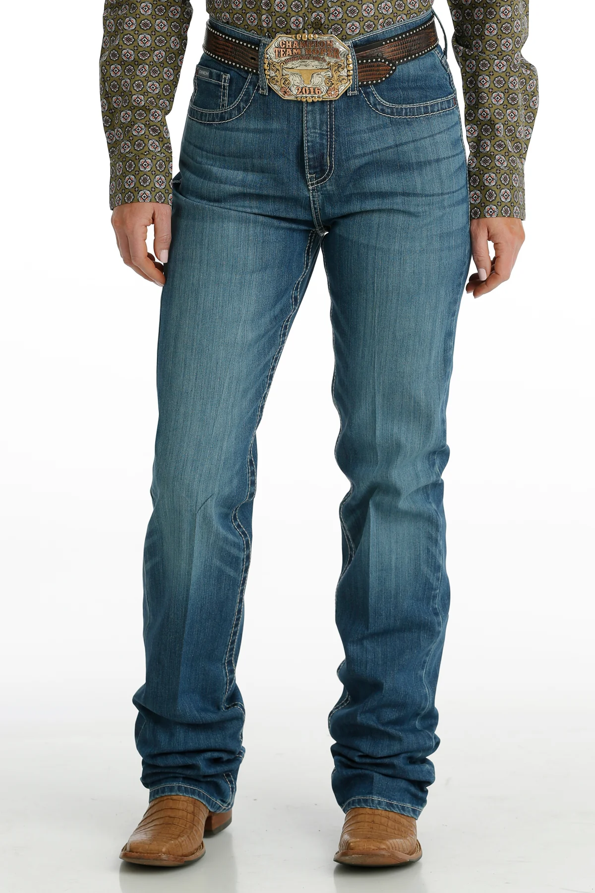 Built for the demands of cowgirls, the EMERSON fit provides a solid foundation for fit with its performance rise, relaxed thigh and knee, and straight leg. Forming this new all-around arena jean is neutral embroidery and medium stonewash with subtle hand sanding and whiskers. EMERSON – Performance Rise, Relaxed, Straight