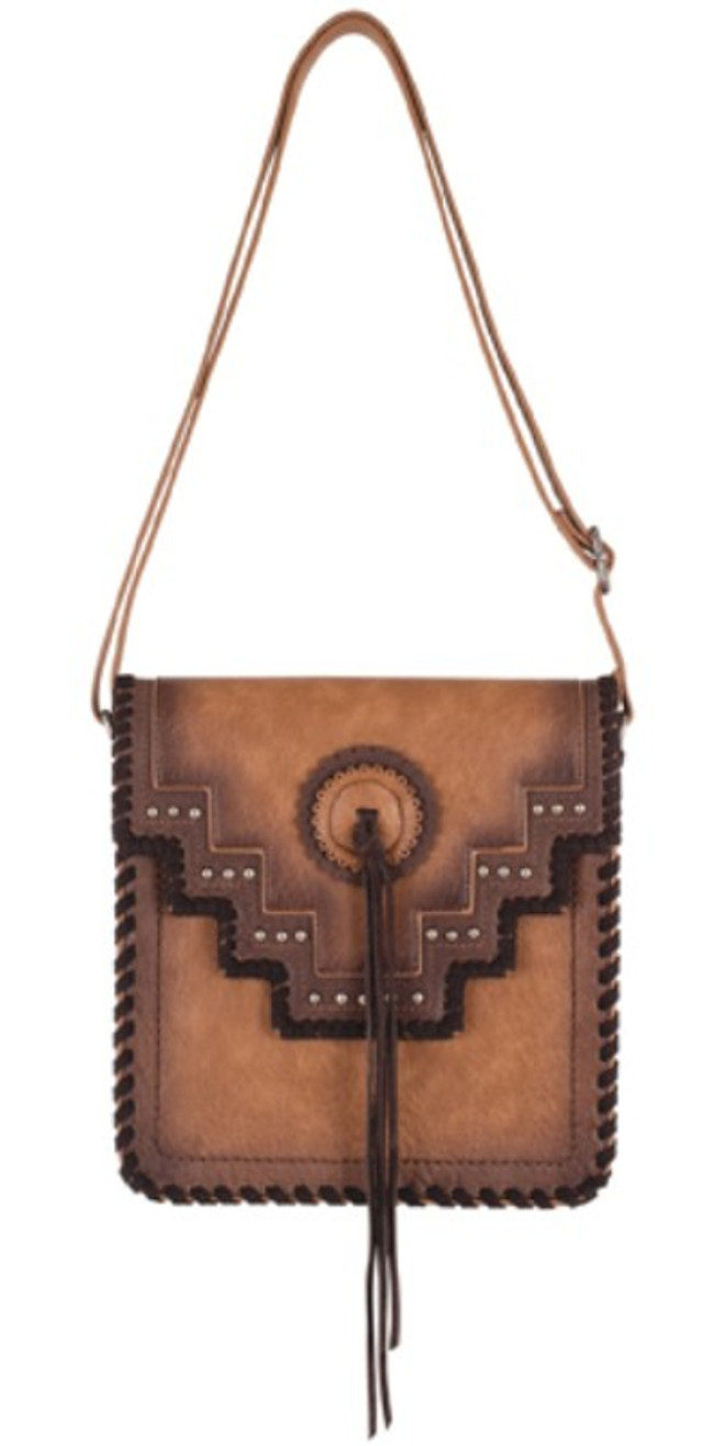 • The Justin Ladies Cross Body Brown with Whip Stitch and Old Silver Studs, PU Concho, and Tassel on Flap is the perfect blend of Western flair and modern functionality. Made from high-quality brown faux leather, this crossbody bag features intricate whip stitching, old silver studs, and a decorative PU concho that adds a vintage touch. The flap is adorned with a stylish tassel for extra charm. With its adjustable strap and compact design, this bag is ideal for carrying your essentials while adding a rustic, boho-inspired accent to any outfit.