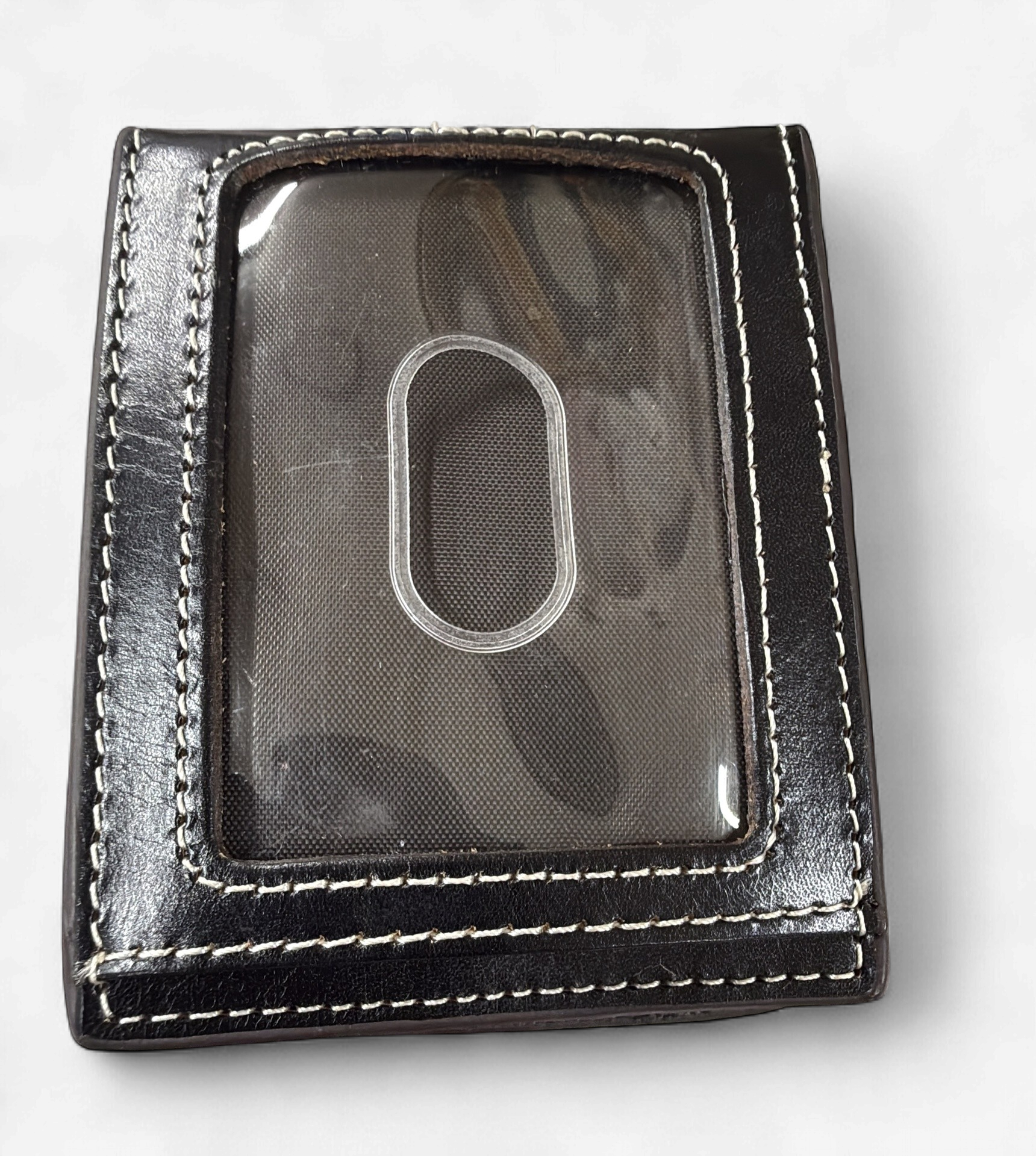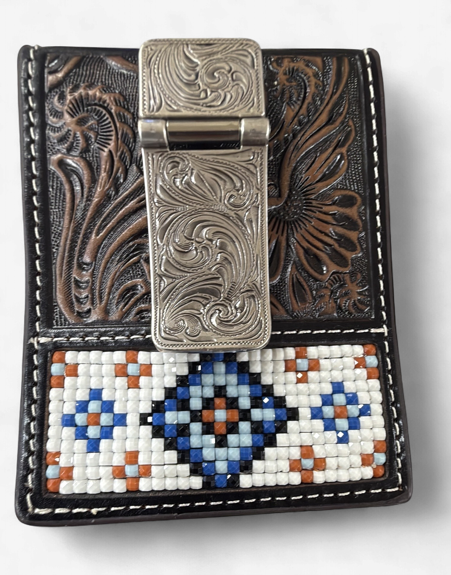 tooled leather behind money clip and beading on the side